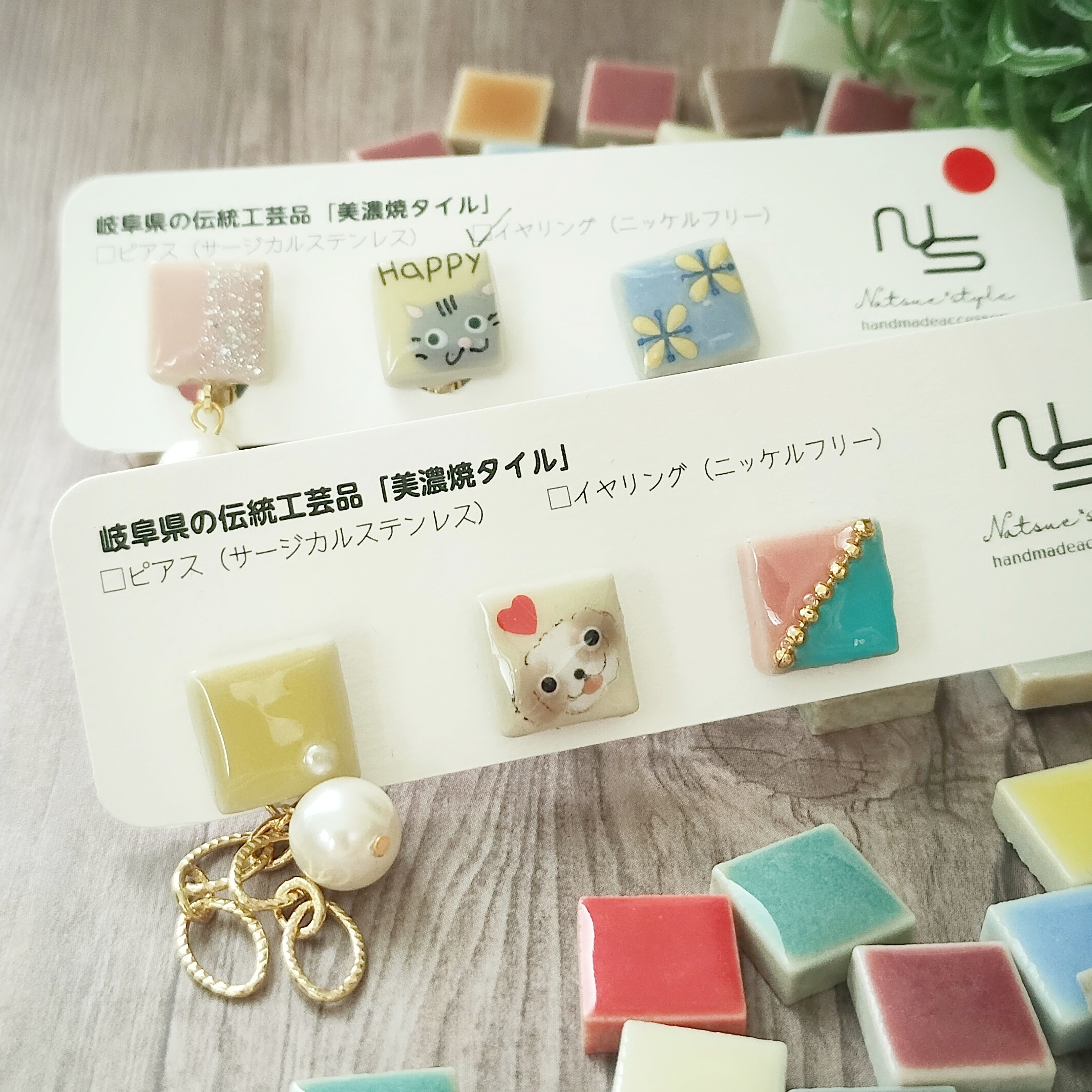 岐阜県の「美濃焼タイル」に絵付けや装飾をしたアクセサリー。